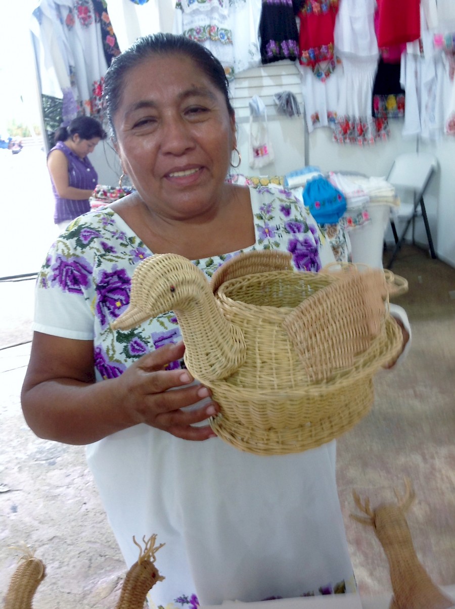 Some outstanding new artists this year include Andres Vázquez Paloma, from Oxcutzcab, who carves award winning bas-relief in cedar. As a young person he started drawing and then was drawn to wood carving. He is mostly self-taught and his work depicts in amazing detail the daily life in the villages of Yucatan. Another new artist, Alfredo Poot Dzib from Valladolid, will present his highly decorated jicara items... lamps, tortilleras and decorative pieces made from gourds. Rosalinda Couich Ramirez of Felipe Carrillo Puerto weaves charming baskets and animals from bejuco, a type of grass. Maria Esther Uitzil of Valladolid Nuevo weaves breathtaking woven shawls in many sizes and colors.