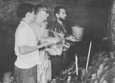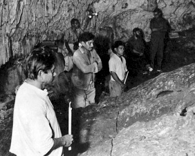But on the appointed day at 8 a.m., the archaeologists joined Ho’il and thirteen assistants (including several boys) to spend more than a full day underground. Andrews and two members of his Dzibilchaltun team, Folan and Stuart, joined Mexican investigators Dr. Barrera Vásquez, Raúl Pavón Abreu, and Victor Segovia to witness the ceremony. Segovia (with Stuart’s assistance) operated a tape recorder during the ceremony.