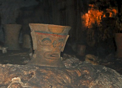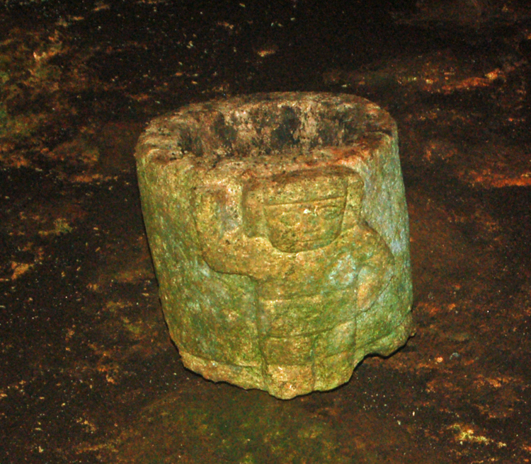 Humberto backed away, and as he did, he shined his flashlight on the ground. He discovered to his horror that he had somehow stepped into an archaeological minefield. Surrounding his feet, in every direction, were dozens, if not hundreds of Maya artifacts: incense urns of every shape and size, many with faces carved into the sides, as well as a wide assortment of metates, the grinding stones the Maya used to prepare maize. If his path had veered by only a foot or two, he would have knocked over or stepped on a vase.