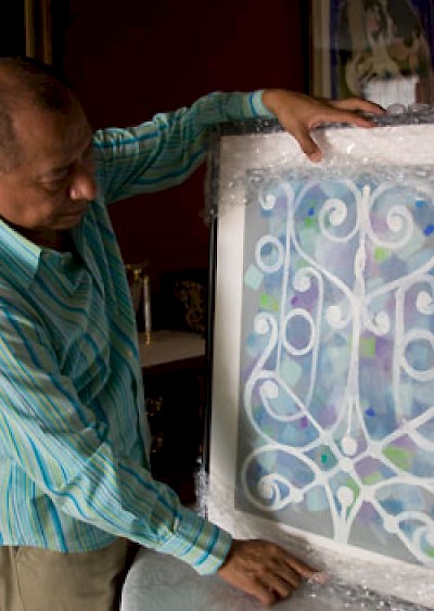 It is obvious that Benjamin is enchanted by color. Though he is the epitome of a reserved gentleman, we have noticed that he is always impeccably dressed... in color. When we walked with him through his garden toward his studio, he explained how the colors of the tropics have been so shocking and surprising to him. Benjamin still shows his work in Philadelphia and people have commented about the bright colors... "But look around you!" , he says, and his eyes light up. "Those colors are real here!" Indeed, as we walk past his glittering aqua blue pool, inset with darker blue glass stones, the green leaves are screaming green next to a yellow you could only find in a box of neon crayons. Then we walk into the shadows outside his studio door and see the subtlest of blues and purples reflected on the white wall. Inside his studio, Benjamin shows us some of his older works... huge canvases filled with patterns of light and dark blue, like the shifting shadows and light on the surface of his pool.