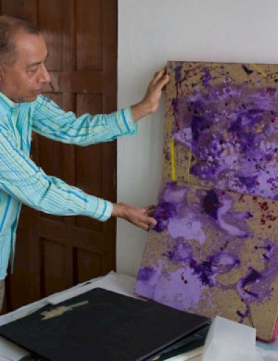 We're seeing colors everywhere, just like we see in Benjamin's drawings. Aaah, now we're beginning to get the idea. A brown canvas with different shades of purple pops out at us, defining a feeling of space that isn't really there. We're beginning to think that appreciating abstract art takes attention, a little bit of concentration and a willingness to let go of preconceived ideas of art. Perhaps these are some of the things that have attracted Benjamin as well, and provided him with the challenge that he so obviously enjoys these days. He's no longer providing healing and support to his corporate patients. Instead, he's diving in and letting go of restrictions and constrictions in a never-ending quest to express the experience of light and space.