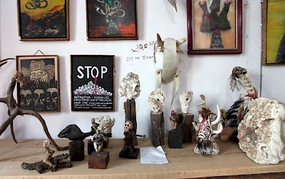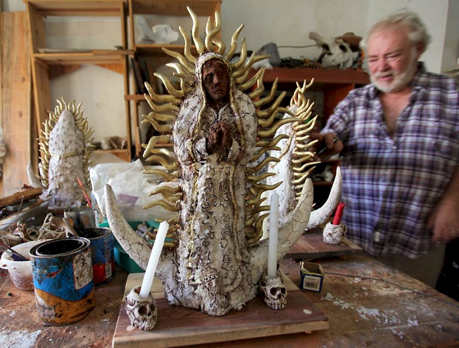 To find out more, we visit the man himself in his Merida studio. Behind the faded colonial facade on Calle 60, south of the Plaza Grande, we find Joseph in his home, his studio and his gallery... one a bit indistinguishable from the next. The floors of faded pasta tiles and the walls stained with years of humidity provide a fitting backdrop to the art that inhabits every nook, cranny, vertical and horizontal space. Sculptures cluster on tables and pedestals in the first room. There, sculptures include found stones, carved stones, carved clay, sculpted clay, wood with feathers and found wood pieces. On the walls, paintings of Christ and other icons mix with skulls and masks created from found objects.