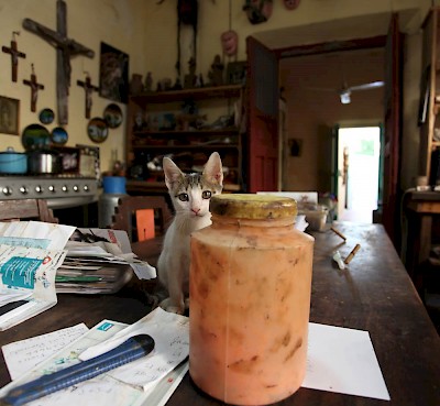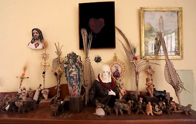 In the kitchen, the center of the house, a wooden kitchen table holds papers, food, pots and an energetic kitten. In the center, a group of sculptures that recall the Venus of Willendorf cluster nakedly on tiny pedestals, facing in all directions. We sit in the kitchen talking, but concentration proves difficult because the walls there are filled with art that Joseph has been collecting here in Mexico. Above one door is a drop-dead mask collection he tells us he found on the street one day when someone was throwing them away. These are vintage masks from around Mexico in fairly pristine condition, whose colors and primitive features seem right at home here. Another wall is filled with crucifixes, something there is no shortage of here in this Catholic country. Joseph's crucifix collection actually spreads to other parts of the house, and ranges from very traditional vintage versions to his almost modern crucifixes created from found branches.