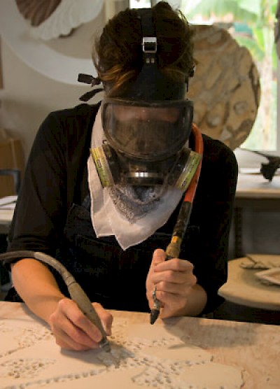 Encouraged by her results, Katherine's experimentation took two directions. She experimented in materials and techniques, while simultaneously experimenting in shapes, concepts and design. Her kiln wasn't large enough to hold the pieces she had in mind, so she began with concrete, learning the recipe from an albaƱile, and expanding upon it. She experimented with sand, ground stone and even saskab, a stone ingredient the Mayans used in building their monuments. She bought her own cement mixer, and experimented with formulas and mixing techniques. When cement proved to be too brittle for the large but delicate pieces she had in mind, she experimented with old newspaper, ground shells and other materials. She eventually turned to resin, adding in cement, saskab and pigments to expand her options for texture, color and finishes. The resin she works with now is not as ecologically friendly as she would like it to be, because it can be dangerous (she wears a gas mask to avoid inhaling the resin dust when she works). But resin provides the lightness and flexibility she needed to create the large, lacy structures that she envisioned.