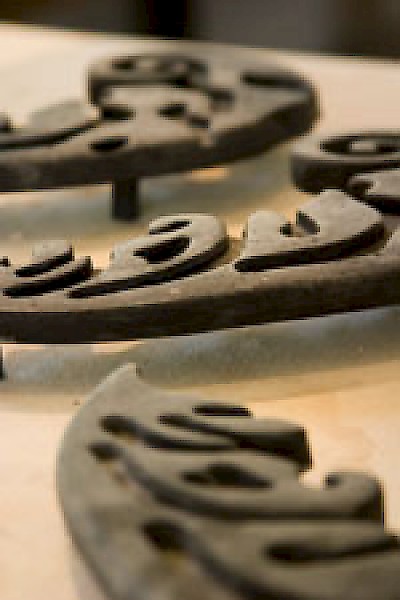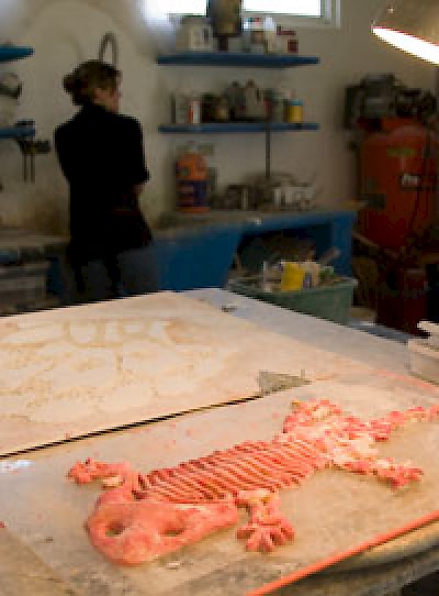With most of her fossil-based works, she starts from the photograph of the fossil, then draws it. From the drawing she forms a sculpture in clay and plastilina, from which she makes a silicon mold. The mold is used to make just ten reproductions, each one of which is then cleaned, polished, and detailed by hand. Each piece may also be painted and all are sealed.