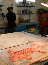 Her latest project began with the fossil of a fish called Seymouria, a reptile-like tetrapod (according to Wikipedia) whose skeleton is found in Texas. Katharine's stylized version of Seymouria is being rendered in resin, but Katharine is still experimenting with the right mix that will allow her to sculpt both sides, creating a three-dimensional representation of a two-dimensional fossil record. She intends to work both sides of the finished product, so the fellow's ribs and feet and other characteristics will be detailed on both sides. The end result will be a quasi-fossil, as if the animal it represents is itself rising out of the record it left behind millions of years ago.