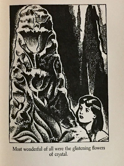 From the room of the jaguars, the exploring party moved on to other caves. Room succeeded room, some mere low earthy tunnels, others wondrous and glistening. Finally, the end was reached in a great room, so beautifully ornamented by nature that no man had dared carve his own handiwork there. Through the ages water falling, drop by drop, from the ceiling above had enveloped every stone and knob and point below in a gleaming crystal-like limestone. As other crystal drops had fallen, these had added gorgeous sculpturing to the surfaces, turning mounds and points of stone into shapes like carved vases, like sculptured figures, like a fountain with crystal drops rimming its edge. But most wonderful of all were the glistening flowers of crystal. Gleaming stone creations, some like tightly closed buds of snow white, other blossoms wide open and set about rounded centers and pointed centers.