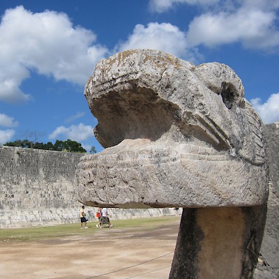 As she trod northward along a fine street paved in crushed stone, shout from a sunken court off to the side rose upward, mingled with the shouts of onlookers on the broad stone paving that surrounded the place. Unresisting, she was swept sideways along this street, with a mass of other travelers who seemed determined to see what they could of the excitement going on down below. Now and again, when bodies shifted, she wriggled her small self forward, looked down for all she was worth, and thrilled to what she saw. Ehen! But thhis must be tlaztli, that strange game from Tenochtitlan that the Aztecs brought with them into Yucatan. And what a place they had built to play it in -- a grand paved court a hundred paces long, with walls fifty hand-spans high. Almost at the top of each end-wall, there projected forward over the court a huge ring of carved stone. Across the game ground itself, swarmed two teams of players wearing nothing but their hip-length kilts and headcords. One band wore red head-cords, the other, green. Now the "Greens" had the great rubber ball, now the "Reds". A point in the game seemed to be for a player to catch the ball on his hip and bounce it in the desired direction. Another point was to hurl the ball upward so as to pass through one of the high-set stone rings.