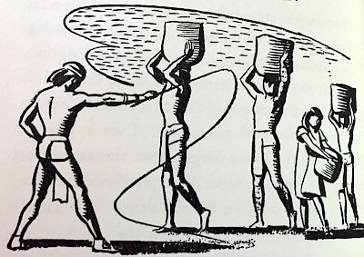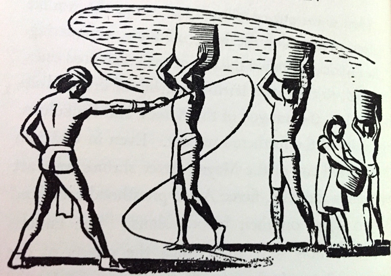 At the killing toil of sledge hauling labored Copan and Nakah. Already the harness thongs had worn galls across their strained shoulders. At each nightfall, the two fell exhausted on straw pallets and slept a sodden animal sleep till the call of the conch horns at dawn. But as months passed, and sore muscles became hardened to the strain, something of humanity came back to the laborers. At dusk around the glow of the cook fires, snatches of talk began to drift back and forth, even a wan joke or two was passed.