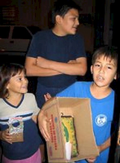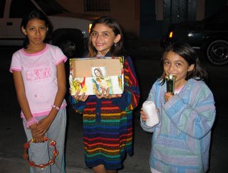 Each night during Advent (the 24 days leading up to Christmas), children of the neighborhood travel from door to door singing a song and collecting money. With them they carry las ramas as well as a picture of the Virgin of Guadalupe, somehow set up with a candle. In the case of our young visitors the other night, it was a little box, with flowers and candles in front of the Virgin. Our employee Fernando who is 24 years old tells us that he used to take big empty cans and cut out both ends. On one end he would put a picture of the Virgen and then he would stick a candle in the other end to make a sort of light box. He has promised to have his sobrinos (cousins) make one for us.