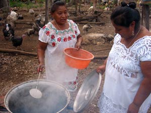 Many of the traditional Maya dishes are made with poultry... originally (and still in smaller, traditional villages) with turkey, but now in Merida mostly with chicken, which was introduced by the Spanish in the 16th Century. It is traditional to include three round mucbil pollos (also known as pibs) on household altars if the deceased is a woman, or four pibs if the deceased is a man. These numbers apparently come from the three-stoned hearth, signifying women, and the four-cornered milpa, traditionally the realm of men. The Cook It Raw program also mentions this, an important thing to keep in mind: