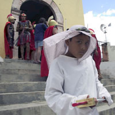 The Maya of Acanceh devoted themselves to the Catholic faith with great reverence and have cultivated one of the most elaborate and authentic of the Passion Plays performed around the Yucatan Peninsula during Semana Santa or Easter Week. As all Christians know, the Passion of the Christ is a play performed since the European medieval period that portrays the traditional story of the last hours in the life of Jesus. The Play begins around noon, takes roughly two and a half hours to unfold and is performed at several different locations around the center of town. It begins with the first trial before Pontius Pilate and includes the audience before King Herod, return to Pilate, the release of Barabas, the scourging and humiliation, the Via Cruces (procession though the streets with re-enactments of the twelve stations of the cross) and the crucifixion. If you pay close attention, other events occur on the side, including the suicide of Judas. These scenes are all portrayed in Roman and Middle-Eastern costumes, with serious devotion on the part of the huge Maya cast, so don't be surprised if the overall effect transports you to an unexpected time and place, a juxtaposition of several ancient cultures.