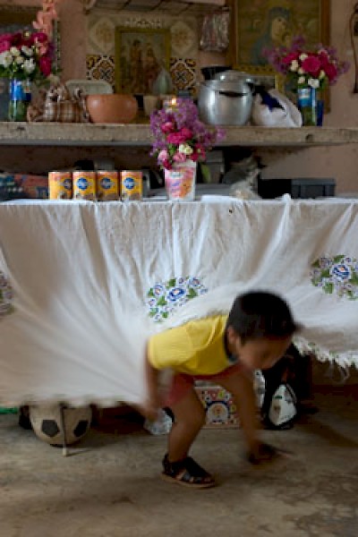 But no one was thinking about these things at the May household. It was a beautiful Saturday, the pavo en relleno negro was plentiful and the Mexican futbol team was playing Argentina in the Copa Mundial. The television was set up next to the family altar. The altar not only houses the family's pictures of saints and ancestors, but also serves as a place to store their clean pots, medicines and is a place to give thanks. Before the food is served, some of it is placed on the altar. And when we gifted their mama dog with four cans of dog food to help her with nursing her puppies, we were amused to see that the dog food ended up on the altar as well. The altar also serves as a place for Miguelito (3 years old) to hide under when playing hide-and-seek with his friends.