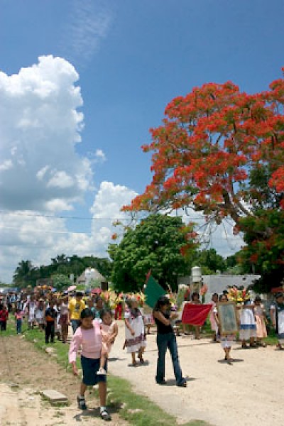 This particular day in this particular town was a most perfect Yucatecan day, and the whole affair created a tableaux worthy of an oil painting. The flamboyanes (flame trees) were burning brightly, contrasting with the clouds in color but mimicking them in shape. The old women of the village walked as they had probably walked for decades down these dusty lanes, carrying flowers as fresh and bright as they themselves had once been, but as their grandchildren beside them were today. People of both sexes and all ages participated in the gremio, but it was the older women and the middle-aged men (their sons?) who seemed the most devout. The heat of the sun was punishing, but the people carried the heavy statues, sang and walked in rhythm to the horn-and-drum music without faltering, in devotion and reverence that was solemn but far from silent. Children played, men set off bottle rockets, women chanted and sang while the gringos took pictures. Que tipico!