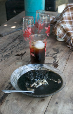 Our regular readers will remember Soco, who is going to beauty school. This is Soco's home, where she lives in three different concrete block houses with her mother (Brigida) and father (Bernabe), her uncle Antionio, her sisters Conchi and Marie, her younger brother Lupe, Conchi's husband and their son, Miguelito. A gaggle of turkeys and about five dogs live outside. Visiting that day was also Bernabe Jr. with his wife and two children. Brigida and her son Lupe had been cooking all morning long, and when we arrived we were treated to a cold Coke, fresh handmade tortillas and a soup bowl full of very delicious homemade pavo en relleno negro. Our regular readers may remember a little pot we took a picture of a whle ago... well, here's what was in the pot!
