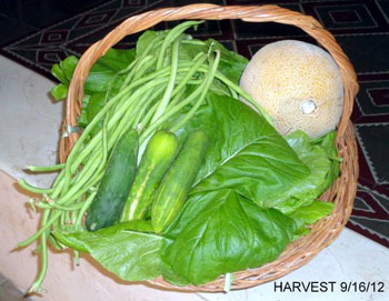 Beans: So far, we have not done well with bush beans. However, we have had delicious success with the Chinese long beans. These are a conversation piece, too, as they grow to about 50cm (20”) in length. After harvesting, you can just cut them to whatever length you want and enjoy. They are tender and flavorful and have worked well in every dish we have put them in. We shared some with a friend and she ate them raw... they are that tender and tasty. The same comments used for Cantaloupe would apply to the long beans. Our seeds were given to us by a friend, and now we save our large beans for seeds.