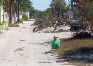 Some old habits truly do seem to die hard. Roo’s daily rummages turned up old shoes, flip flops, rotten coconut shells, plastic bottles and pretty much anything that stuck out like a sore thumb on the beach or the road. She’d pick them up in her mouth, toss them around a bit, then retrieve them for a satisfying chew. One memorable day as we stood outside the gate talking to a neighbor, I heard the pounding of paws running towards us with her latest find; a large, neatly knotted, green garbage bag was dangling from her jaws. Socks trailed after her with the look of helpless motherhood. Always reminded of our limited time together, I commemorated these funny moments in pictures whenever I could. Roo’s trash ventures added an extra 5 pesos to our disposal fees every few days, but I could hardly fault her. The garbage problem in the Yucatan is a clearly cultural issue that serves as both blessing and curse to homeless animals.