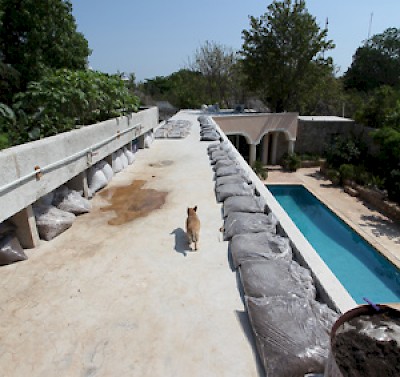 Never one to back down from a challenge, Robert spent a few brain cells and some investigative months figuring out how he was going to have a Victory garden at his renovated colonial home in Merida. He realized that while he didn't have a lot of land, or even a lot of soil for that matter, he did have a large and flat roof. He combined that asset with information his daughter told him about the Earthbox (see link at the end of the article). He tossed in his experience in Italy, visiting Puccini's home where his rooftop garden was all built at waist height, so he didn't have to bend down. And with all that composting in his active brain, he came up with what has proven to be a successful and productive roof garden system.