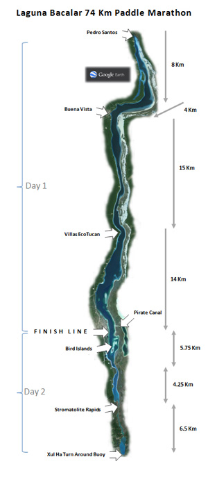 The first leg of the race is about eight kilometers and stretches from the lake's northernmost tip until the dogleg to the right and west. The dogleg itself is four kilometers and is followed by two long stretches to the south. The first is fifteen kilometers between Pedro Santos and Villas EcoTucan, and the second is fourteen kilometers from EcoTucan to the Balneario Aseradero in Bacalar pueblo. These distances are not what the racers travel. Every racer will go as much as ten percent further due to shoreline irregularities and winds.