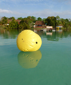 That said, the yellow buoy so close ahead exhilarates our paddlers. It seems to maintain a distant position for a very long time. The Xul Ha cenote is draining north in a slow current and there is a slight wind from the southeast, so the paddlers hug the western shore and work hard to make way. After too much time, the buoy is rounded and the paddlers begin the return trip north.
