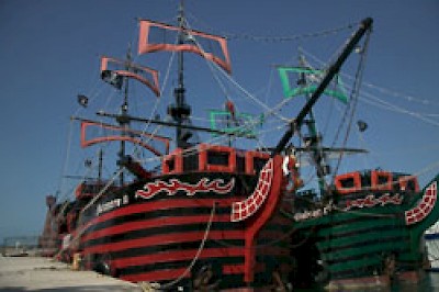 At the start of Avenida Kukulkan, the main avenue that travels the length of Cancun's Zona Hotelera, is the Embarcadero at KM 4. (If you remember the numbering scheme, that places the Embarcadero at 4 kilo-meters from the northern entrance to the zone). From there, boats travel regularly to Isla Mujeres, a wonderful island paradise off the coast ($165-180 pesos roundtrip for a 20-minute ride each way). There is also a theatre where Mexican comics and singers perform. And parked at the dock are Captain Hook's pirate ships, a definite favorite with young boys and girls, either just to visit or to go sailing on one for a dinner cruise. Dinner cruises leave at 7 pm and return at 10:30 pm. They serve steak and lobster and cruise Cancun Bay, with the boat lit up like a Christmas tree.