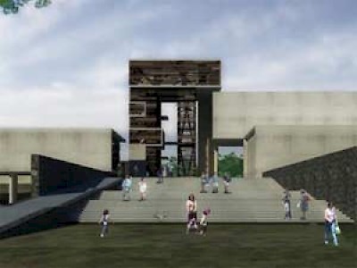 Palacio de la Civilización Maya in Yaxcaba. This museum is proposed for construction in Yaxcaba, a small village located about ten kilometers from Chichén Itzá. Yaxcaba also happens to be one of the poorest communities in the state. The Palacio will take advantage of existing features of the community, at one end anchored by the town’s cenote, a large freshwater sinkhole that has provided water for the community for centuries. In the plan, a 110-meter white path (sacbe in Maya) will be the architectural element that ties the museum facility together, connecting an entrance plaza with three individual structures. The entrance plaza will be built in a stairstep fashion to evoke the “fragmented structure” of El Castillo, the dominant pyramid at Chichén Itzá. The entrance plaza will house a box office and a reception area for groups. Inside will be a 300-seat IMAX theater and requisite gift shop, as well as a courtyard, an outdoor amphitheater, and a museum section dedicated to the origins of the Maya world. One of the exhibitions will be called “The Treasures of Chichen,” and will exhibit the gold, jade, and other artifacts that have been extracted from Sacred Well.