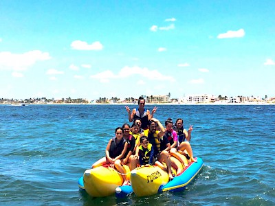 Carlos offers the Banana for rent for about three dollars to any person who wants to jump on it for a few minutes. Three dollars is good for a wild ride across the shallow waters of the Gulf of Mexico off this popular beach on the north side of the Yucatan Peninsula.