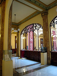 The building is a work of art. The Palacio anchors one end of Alameda Park, and is a joy to behold from its sunset-colored glass dome to its marble steps. Enter under the marble statues that adorn its façade, and be treated to as perfect an example of Art Deco design as you are likely to see anywhere. We just missed the Diego Rivera exhibit (they hadn’t even removed the art yet… we could see a few pieces wrapped up and ready to ship as we gazed longingly through the locked doors of the exhibit hall). But we were still able to enjoy again the murals that grace the interior. These murals were painted by Rufino Tamayo, David Siqueiros, Jorge Camarena and Diego Rivera. They are each powerful and beautiful in their own ways and are on permanent exhibition in the balcony areas of the building. Jorge Camarena’s mural called Libertad is probably our favorite, though Rivera’s complete recreation of the mural that he painted for Rockefeller in New York City and that was consequently destroyed is also breathtaking. The Bellas Artes also has a lovely coffee shop (not open until 12:30 PM, according to the waiter, and not really serving until 2 PM) and a large bookstore with mostly art books. Of course, Bellas Artes is first and foremost a performing arts center, but this is an aspect of it that we have not yet had the pleasure to experience. By the way, the Diego Rivera exhibit was just one part of a National Homage to Senor Rivera in 2007, which included exhibits in six locations, one of which we did manage to see at the National Museum of Art.