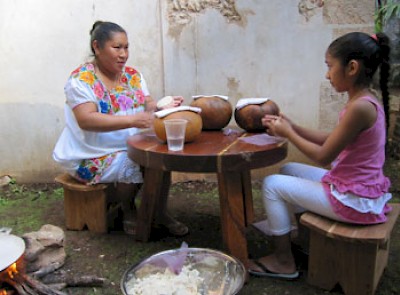 Out under the painted ceiling and in front of the magnificent mural, lunch was served, accompanied by all the handmade tortillas that were NOT made by our band of beginners. We also feasted on cochinita pibil, guacamole, beans, pork ceviche, fresh peppers stuffed with crushed pumpkin-seed dip for the crisp totopos (tortilla chips), all topped off with wine, soft drinks and those ever-present Coronas.