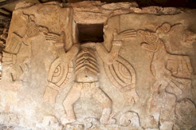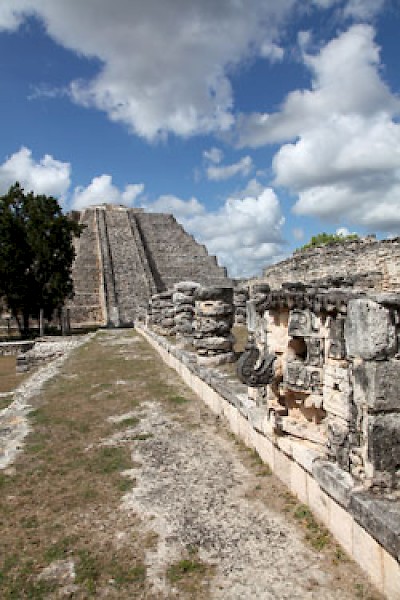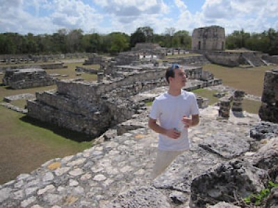 We climbed the Castillo there and were treated to a view of the surrounding countryside as far as the eye could see and a cool breeze, reaffirming our personal suspicion that the rulers built these pyramids as primitive air conditioners, to get out of the heat of the jungle. We climbed inside the Observatory, a smaller version of the Observatory at Chichen Itza. Between the two is a cenote which we could not climb into, much to our dismay. Instead we were rewarded with views of stucco sculptures that had been uncovered on the sides of the pyramids. Julia explained to us that these sculptures probably represented the afterlife and that the holes where their heads should have been were found full of the bones of human skulls. Neat!