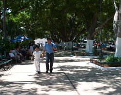 Zocalo is a generic term for the buildings surrounding a central plaza. The term is used by Mexicans to mean THE Zocalo in D.F., but sometimes it is also used by those who are not native to Merida, to indicate the Plaza Grande. The Plaza Grande marks the center of the center, the very centro of the centro historico of Merida. Bounded on four sides by buildings which include the Catedral San Idelfonso, the Governor's Palace, Casa Montejo (now inhabited by a modern conquistador, Banamex), the MACAY museum, the Olimpo (a cultural center that houses gallery space, a movie theatre and the Planetarium) and the Ayuntamiento (City Hall), the Plaza Grande is a lovely park where people come to meet, sit, get their shoes shined, protest, sell, buy, read the paper, sing, dance, chase the pigeons or just watch the world go by. There are also newstands, coffee shops, a Dante bookstore, a hostel, a few places to buy fresh juice and various and sundry other retail establishments.