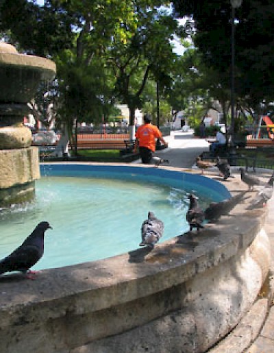 Throughout the park are monuments to all the different countries of North and South America, in a style that pays homage to the Mayan culture in direct opposition to the area's heritage of Spanish conquest. The park was built to represent the unity of the American people, pre-Hispanic cultures and socialist ideals. The park has a large fountain in one quadrant, a performance space with a concha (half-shell) open-air auditorium in another and the Jose Martí cultural center in a third. The fourth quadrant is fenced off and reserved as a children's play area. Our friends have told us that there was once (and probably still is...) a cenote underneath the concha. Today, residents enjoy the park for sitting in the shade, attending cultural events, and walking or running around the perimeter for exercise. On weekends, the park is often the site of athletic or cultural events.