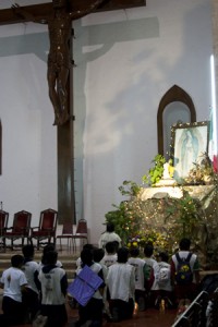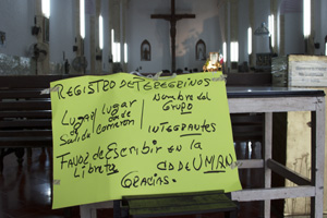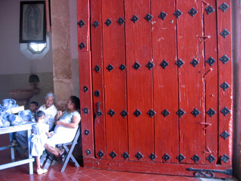 Speaking of the Virgen de Guadalupe, Uman is a center of activity on el día de la Virgen, December 12. While the area around the destination church in Merida, San Cristobal, gets incredibly crowded on the night of December 11 and 12, the church in Uman, the ex-convento de San Francisco de Asís, does not. Many of the antorchistas (torch bearers), the runners and bicyclers who make a peregrinación (pilgrimage) from places all over Mexico, end up in Uman as well as in Merida. The church there is huge, as are the grounds around it (as is the big red front door, as you can see in the photo), and many teams of travelers end up there resting on the lawn or giving thanks inside the church.