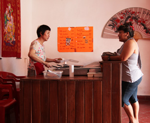 Once back in the town of Uman, we headed straight for the recommended cocina economica, which is located on one of the side streets that pour into the main intersection in front of the church, just about a block from the church. That was back in 2011, so we cannot guarantee the place is still there, but if it is, we highly recommend it if you are in the mood for Chinese food! The woman who runs the place is from China, and moved here just a few years ago with her son. She barely speaks Spanish and at the time, could not communicate about much more than the food she was serving. She depended heavily on the menu, printed on the wall inside and outside the establishment. Which did we prefer... Pollo agridulce (sweet and sour chicken)? Or Chao Main? Ha! We had a delicious lunch with more than enough food for one person, all for the low low price of $30 pesos each, plus of course the ubiquitous Mexican Coca fria. We left completely satisfied customers, and by the looks of the line forming when we left, we were not alone.