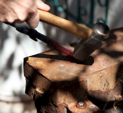 La vida de Jeff en Mérida ha sido hasta ahora tan tocada por la serendipia como su tortuoso viaje hasta aquí. Nos contó sobre su búsqueda de un yunque. Los yunques son bloques sólidos de acero... no algo que pudiera importar como su horno o el resto del equipo en su taller. Jeff quería un yunque viejo... de hecho, tenía la idea romántica de encontrar un yunque antiguo, algo difícil de encontrar hoy en día en los Estados Unidos.