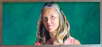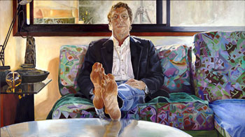 La segunda pintura, Paul Weisman, retrata a un hombre de mediana edad, saludable, bronceado y descalzo, sentado en un sillón de su sala. Mundano, sin duda. Lo que llama la atención en esta pintura es el par de pies, que anteceden a su rostro en la composición. Podrías estar sentado frente a este hombre en esa misma posición y no notarías sus pies en la vida real, pero en la pintura, sus pies están al frente y casi al centro. Son pies bellamente representados, con curvas, arrugas y dedos sanos... pies claramente fuertes y capaces de sostener a este hombre, que sí parece seguro y bien plantado (perdón, no pude resistirme). Los pies te llevan al rostro del hombre, que es rocoso y gastado, con arrugas y muchas facetas, como moldeado por años de sol y experiencia, y tal vez con un dejo de tristeza. La pintura transmite la sensación de que debe haber sol y agua cerca. Quizá son las toallas sobre los cojines del sillón, o los colores azul-verde, o incluso la superficie vidriosa de la mesa de centro bajo sus pies descalzos. Y aunque vemos al hombre completo, todo lo demás está representado por partes. Solo vemos esquinas de mesas y sillas, lámparas y ventanas, indicios de escaleras y tal vez un trípode. Podemos ver al hombre, pero no somos invitados a su mundo.