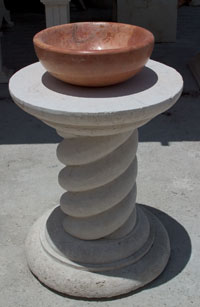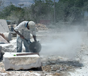 Hay tres tipos básicos de piedra, todos ellos variedades de piedra caliza, que se encuentran localmente y se usan extensamente en construcción y decoración aquí y en todo México. La piedra más suave es una caliza blanca llamada conchuela o coquina. Tiene una apariencia similar al mármol, a menudo con diminutas pero visibles conchitas marinas y es bastante porosa. Por eso, no es una buena piedra para usar en pisos o encimeras, pero es excelente para esculturas, apliques de pared, molduras, columnas decorativas, bases de mesa y marcos. La otra piedra blanca se llama macedonia y es mucho más densa y dura. Se pule muy bien y se usa en todas las formas en que se usa la conchuela, pero también puede emplearse en lugares como baños y cocinas. La tercera piedra se llama piedra de Ticul, en honor al pueblo cerca de donde se encuentra. Es de color naranja o rojizo, y también puede usarse en ambientes húmedos. Es densa y también se pule bien. Estas piedras a veces se conocen colectivamente como cantera.
