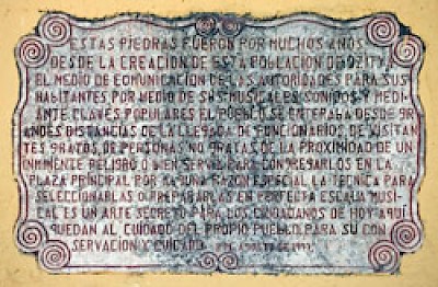 En un extremo de la polvorienta plaza del pueblo se encuentra el Templo de la Inmaculada Concepción, una pequeña iglesia amarilla adornada con banderitas de colores el día que fuimos, vestigios de la reciente fiesta. A la sombra de unos árboles viejos al costado de la iglesia nos topamos con una mujer maya vendiendo fruta y un niño maya vendiendo discos piratas. Y como esto es México, el niño anunciaba sus productos a todo volumen por un improvisado sistema de sonido. Resulta que este es el lugar tradicional para hacerlo. Una bella plaquita en la pared junto al parque infantil dice que solía haber allí unas piedras que, al ser golpeadas con un mazo, sonaban con un tono claro y único. Los pobladores usaban esas piedras para convocar a la comunidad. Le preguntamos a la mujer maya, “¿Dónde están las piedras?” —¡Robadas!— fue su respuesta. No supo decirnos cuándo, pero las piedras se llevaron hace tiempo, y todo lo que queda es una placa. La placa, que lleva fecha de 1977, dice que el arte de seleccionar y reparar piedras que emiten estos tonos musicales en escala perfecta es un arte secreto conocido por ciertos ciudadanos de este noble pueblo y que se guarda celosamente para permanecer dentro de la comunidad. Solo queda esperar que, aunque las piedras ya no estén, el arte siga vivo en Dzityá.
