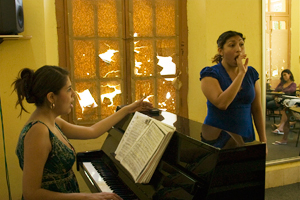 Después de los ejercicios grupales, Carla trabajó con algunos de los estudiantes de manera individual. Ellos llevaban su aria preferida, ella leía la partitura, la sacaba en el piano y luego ellos cantaban para ella. Les daba retroalimentación, les pedía que lo intentaran de nuevo pero con más de esto o aquello, y luego les daba ideas sobre los tipos de roles operísticos adecuados para sus voces. Le dio a una de las chicas un cuaderno de partituras que había traído de Estados Unidos, y ella lo aceptó como un tesoro. Carla nos contó después que muchos de sus amigos tiran montones de partituras si no están impecables o no son de cierto editor… pero aquí cualquier partitura es apreciada por estos estudiantes, ya que no son fáciles de conseguir.