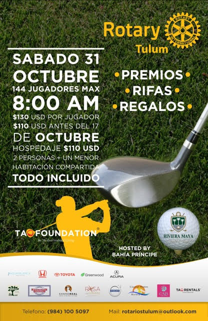 The Rotary Club of Tulum and the Tao Foundation will host their first Annual Charity Golf Tournament on Saturday October 31st, 2015 at Bahia Principe Golf Course. Proceeds from the event will benefit the Tulum Rotary Club and the Tao Foundation. The Tulum Rotary Club works in the communities of Tulum, Yaxche, Sahacab Mucuy, Macario Gomez and Francisco Uh May on diabetes testing, dental hygiene clinics, health care, education, environmental awareness programs and support of the Tulum Red Cross and Fire Company. The Tao Foundation works closely with Rotary and sponsors projects in children's health, special surgeries for children, education, and diabetes outreach information services and testing. The corporate sponsors for this year’s tournament are Acura Playa del Carmen, Agua Blanca, Coastal Homes, Greenwood Property Services, Hamburger Station, Honda Playa del Carmen, Hotel Gaia, Kanino Real, Los Arboles Tulum, Rosa del Viento, Tao Rentals, Toyota Playa del Carmen and Volvo. To register: email rotariostulum@outlook.com or call 984 100 597.
