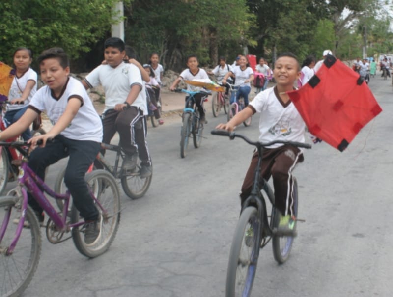 On the last day of school before the Semana Santa holidays, the children of Ricardo Flores Magon elementary school went on a bike ride through their town, then headed off to the Pedro May baseball field to meet their parents and fly kites. Eventually, they had more than 100 kites in the air.