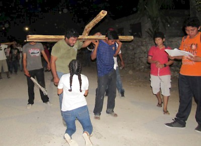 The week before Semana Santa devotees of all ages are busy getting ready to present the Living Way of the Cross. This is a special year in Sitilpech, Izamal because Gaspar Aguilar Burgos has asked to carry the cross for a second year, this time as a whole and healthy man. Three years ago, while riding his motorcycle, a vehicle crossed the center line and hit him head-on.