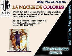 The night before Noche Blanca, SoHo Galleries is having a Noche de Colores exhibition with D.F. artist Jorge Aguilar and sculptor Federico Rivero. Jorge will be painting on piece on canvas live in the gallery, and that painting will be auctioned off at 9:00 PM. The proceeds from the auction will go to help support Brazos Abiertos. Jorge Aguilar's work is bold with a modern Mexican flavor. Both nights will be open with food and wine.