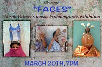 This event is an exhibition of Alison Palmer’s Masks and Photographs. Some of the masks made by students in the February mask-making workshop will also be shown. Music will be by Steve Katz of Blood, Sweat & Tears.