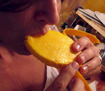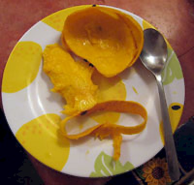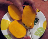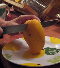 Hold the end of the mango that was previously attached to the tree towards you. With a sharp knife, slice into the fruit with the knife parallel to your body and cut straight down. Repeat on the other side. What you have now done is cut off the two 'rumps' or nalgas of the mango (is there any doubt that mango-eating is a sensuous experience?). The center part contains the semilla (seed). Start eating your mango by holding each plump little nalga in your hand, and spooning the mango out like you might a dish of ice cream or a half of an avocado. A ripe mango will just lay still and submissive as you spoon its tender flesh into your mouth with an ease we had not previously thought possible. After devouring the nalgas, pick up the half-naked semilla, peel off the skin on either side, and hold it at its base as you nibble the remaining flesh clinging to the large hard seed. (This part of eating a mango is sponsored by the Dental Floss Lobby.) When you have nibbled it from top to bottom, just toss it onto the plate...you are done!
