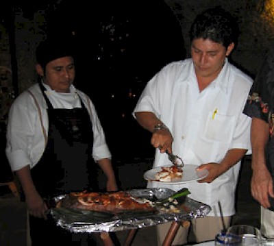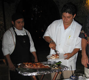 When we had finished our salads, the waiter showed us a large mero that had been grilled tikin xic (pronounced TEEK-en-sheek) style for the occasion. We offered our thanks to the grouper for giving his life for our nourishment, and then the fish was portioned and served.