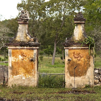 A few days later, our Canadian friends, Ron and Dee Poland arrived for their winter stay at their Hacienda Santa Inez, near Dzitás. We invited them to supper one evening and I explained the frustration with my inability to find an explanation for the now mysterious symbols. Dee’s eyes lit up like a Christmas tree, and she exclaimed, “I have seen those markings on gateposts at an abandoned hacienda near Cenotillo.” I thought, “Uxmal, Yaxcopoil, and now Cenotillo. Maybe aliens brought them. If you cannot explain something, you can always blame aliens!”