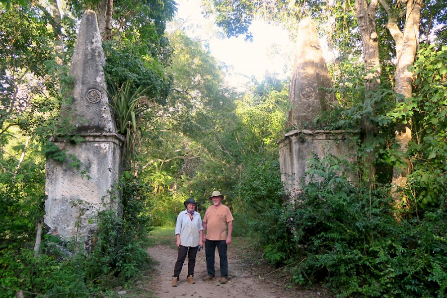 Finally, there it was, the elegant entrance to the Hacienda Santa María. A dramatic gatepost more than 15 feet high, stood majestically on the left side of the road with our secret symbol clearly exposed. On the right side of the road was an equally majestic pillar covered with tree branches and vines. Ron attacked the vines and branches with his trusty machete and was soon able to expose another of our secret symbols. I murmured out loud, “What in the dickens do these things represent?” Not a single bird, insect, or reptile, all of which know the answer, would speak up. There was only silence. Time to fire up the computer.