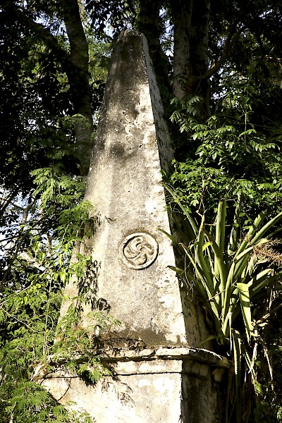 Three chimneys used in the processing of sugarcane are still standing and quite magnificent. The entrance gate that Don Simon built is stunning. Additionally, what caught my attention was the smaller entrance gate built by Don Lorenzo Evia almost 350 years ago. The gateposts had weathered time and the elements quite well. I took photos of the gateposts from both the entrance and exit sides. My wife, Rebecca pointed out a most unusual, but very attractive symbol on both sides of the gateposts. We had never seen this symbol before, so we asked Bersaín what it represented. He was not sure of its origin and we were left puzzled as to what it was and where the concept came from.