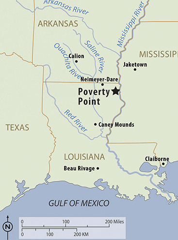 And not far away, on Bayou Macon, we come to Poverty Point, the largest city in the region, and now a World Heritage site. “Poverty Point was built between 1700 B.C. and 1100 B.C. There was a lot going on around the rest of the world at this time. In Egypt, Queen Nefertiti and the boy pharaoh, Tutankhamen, ruled. In Britain, Stonehenge was being finished. In China, the Shang Dynasty was flourishing. In Mexico, the Olmec were rising to power. In India, the Rig Veda, the oldest of Hinduism’s sacred books, was being written.” (see link to the Poverty Point website below)